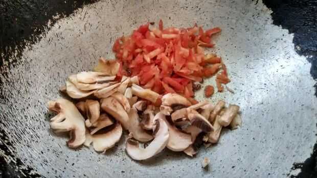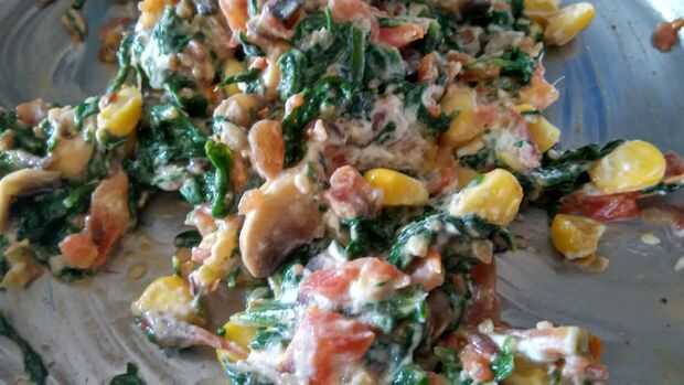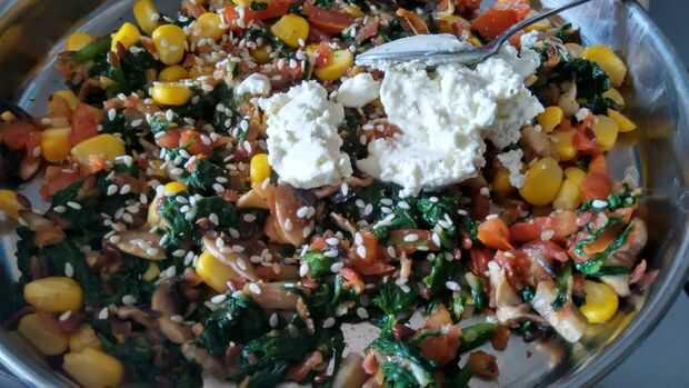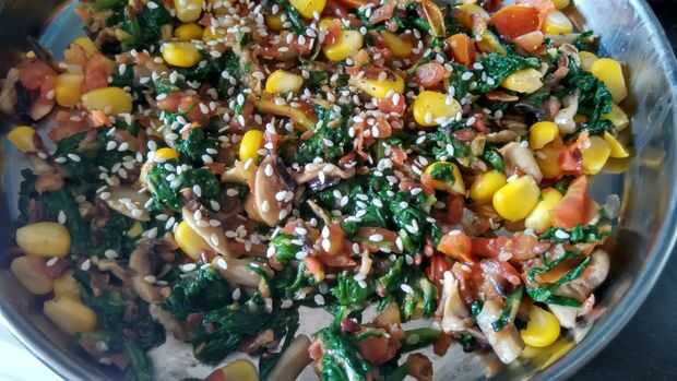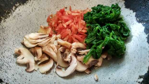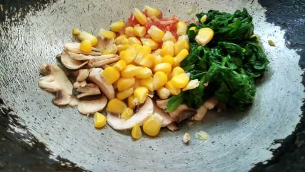 2. ahora, derrita la mantequilla en una sartén. Y agregar las cebollas picadas, zanahoria, hongos, tomates, maíz y espinacas saltear por 2-3 mentas a fuego alto.