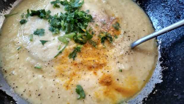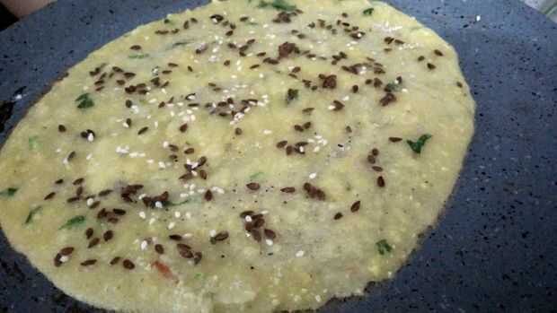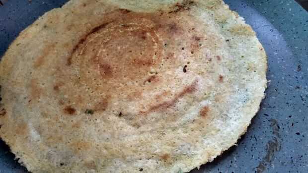 8. calentar un tawa (sartén de hierro) y engrasarlo (no necesario en el caso de tawa antiadherente). El tawa no debe ser demasiado caliente otra cheela (abrigo) se distribuye uniformemente y romper.