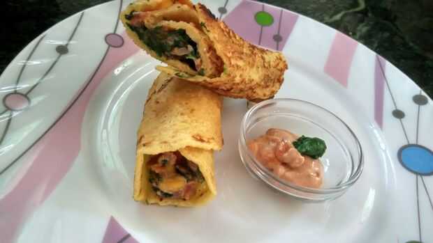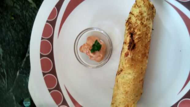 13. los lados de lo cheela (abrigo) del rodillo sobre el relleno. Retirar del fuego y servir caliente con salsa de tomate o cualquier descenso de su elección. Puede cortar el rollo en trozos diagonales de 2 a 3 para mejor presentación.