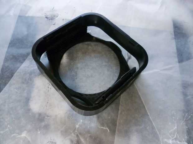 Colocar la cubierta de lente para el soporte del filtro. Asegúrese de que el soporte del filtro es medida en el parasol del objetivo como sea posible. También asegúrese de que el paño está en el interior de la visera del objetivo. Tire hacia atrás la tela de un lado y aplique el pegamento en el interior de la visera del objetivo. Presione la tela hacia el lado con pegamento. Repita para los otros tres lados.