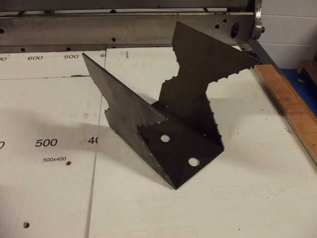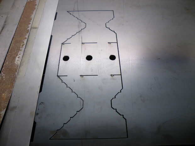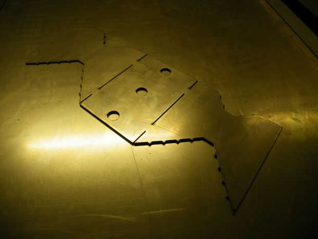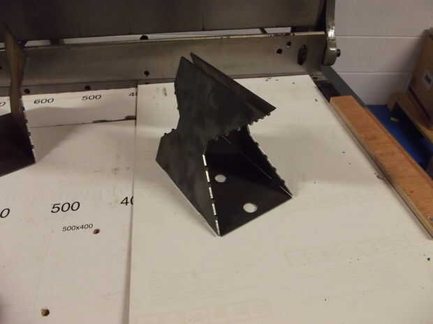 El diseño podría trabajar con material más fino, pero parecía de 3mm sobre el grosor adecuado para la fuerza que estaba buscando, así que decidí perseverar con él. Decidí hacer la vida más fácil para la carpeta mediante la adición de cortes a lo largo de las líneas de doblez, esencialmente dejando sólo un par de lengüetas cortas en el lugar. Tengo pude admitió derrota en esta etapa y recortar sólo la parte en tres pedazos, pero que componen ajuste para la soldadura mucho más incómodo y lento.