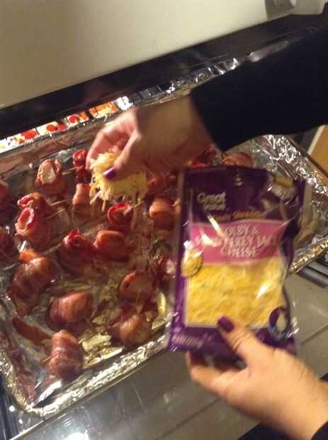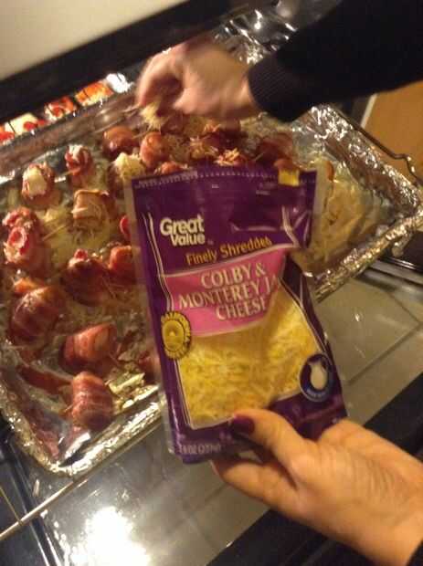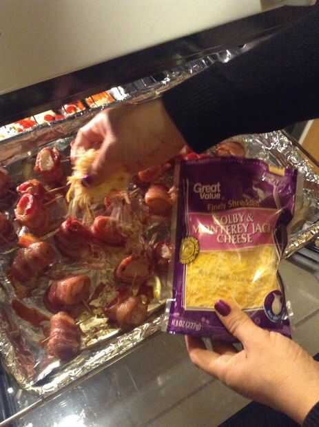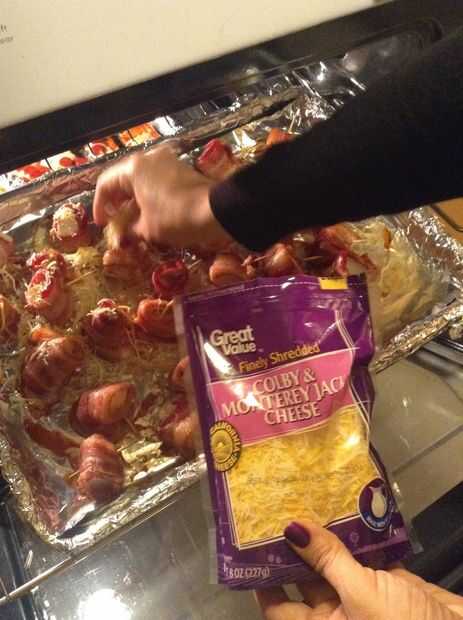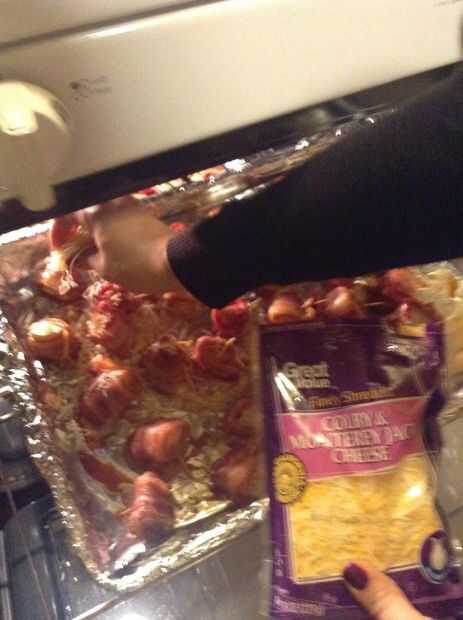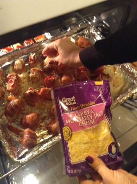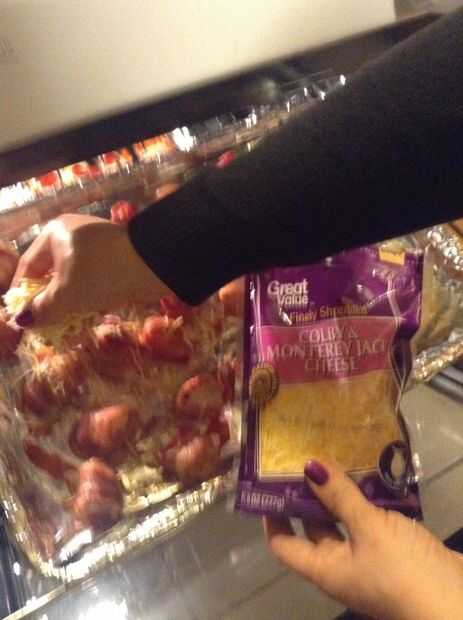Retire la bandeja para hornear del horno y espolvorear con queso cheddar rallado. Vuelva a colocar en el horno durante 3-5 minutos. Entonces, retire del horno.