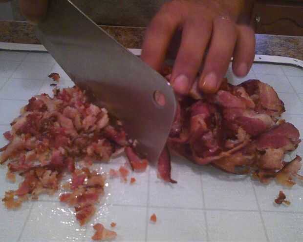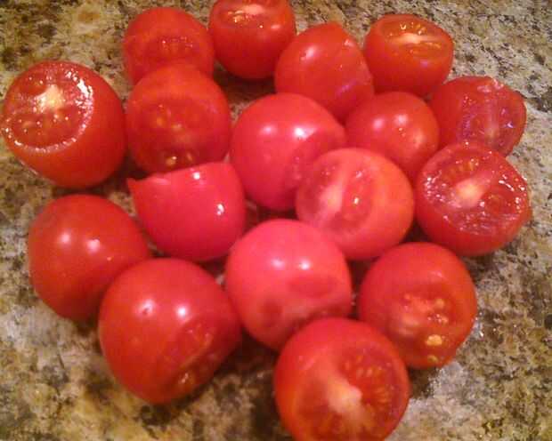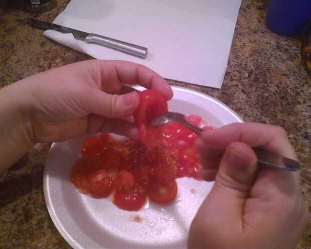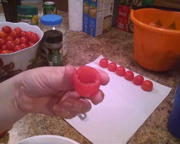 Finalmente preparar los tomates, el primer paso es cortar la parte superior. Asegúrese de no cortar fuera demasiado. luego tomar una cuchara pequeña y con cuidado sacar las semillas y las entrañas. Deshacerse de ellos cuando se hace. Una vez que se hace y luego coloque los tomates boca abajo sobre algunos toalla de papel para hacerles drenaje.