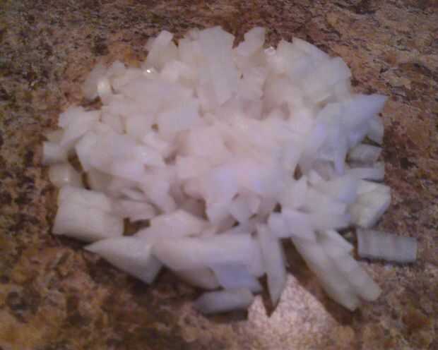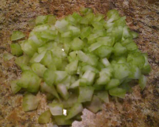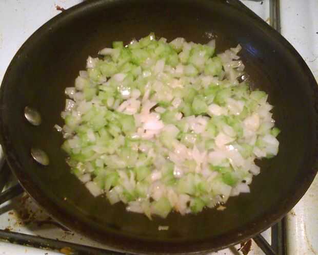A continuación, trocear la cebolla y el apio. Poner en una sartén pequeña y saltear ' en 1 cucharada de aceite de oliva durante unos 10 minutos a fuego medio.