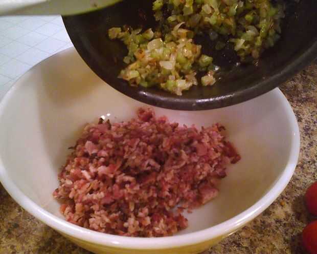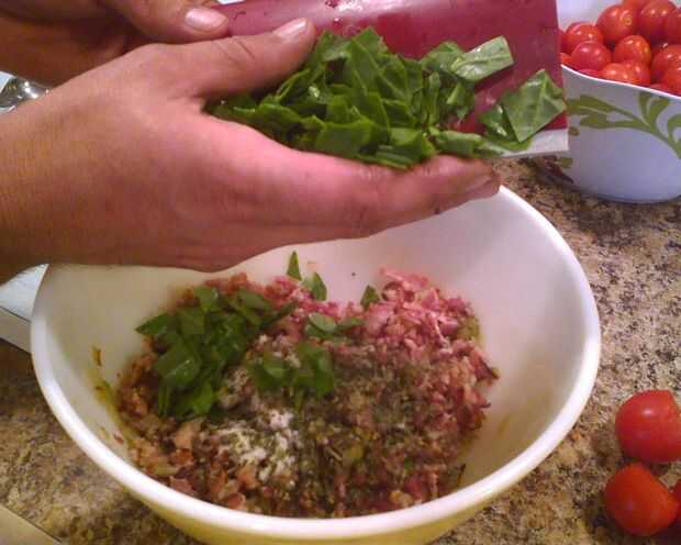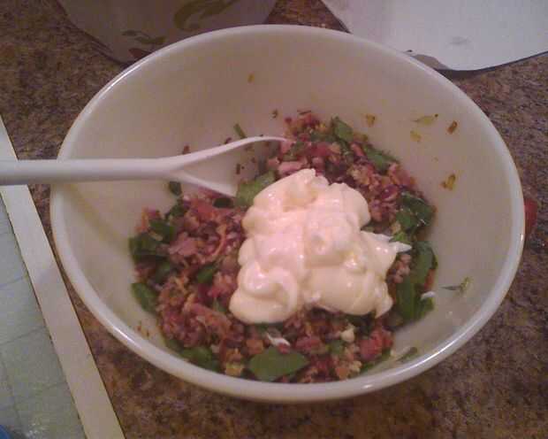En primer lugar, añadir el salteado apio y cebolla en el tazón de fuente con el tocino y mezclar.  Luego, agregar el perejil, hojas de espinaca y queso parmesano.  Mezclar bien.  A continuación, añada la mayo y mezclarlo todo junto.