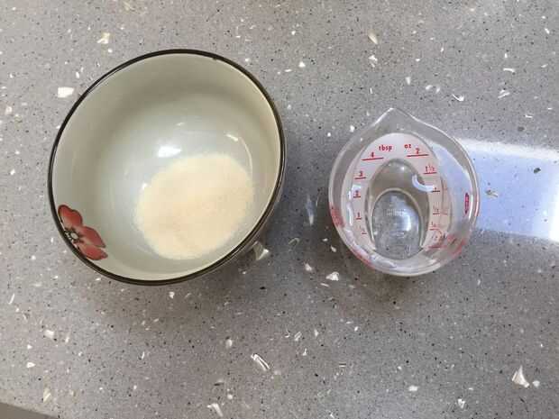 Combinar los dos paquetes de gelatina y 3 cucharadas de agua en un tazón pequeño.