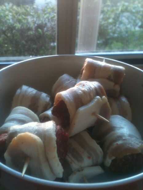 Este es mi primer Instructable nunca. Por supuesto tiene que ser algún tipo de alimento. Es una salchicha polaca, envuelta en la caliente Salchicha italiana a granel, envuelto en "filete de sartén", envuelto en tocino. Nunca antes tenía todo est