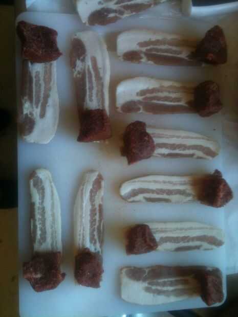 Después de rebanar y cortar en cubitos y tener todo tipo de diversión con su bistec, colocar cada pieza en un extremo de la panceta. Enrolle el tocino y pegue un palillo de dientes en mantenerse de envoltura durante la cocción. Hacer un ejército de ellos y los llama las calorías.