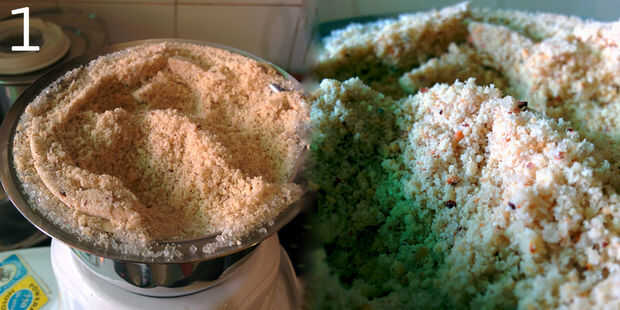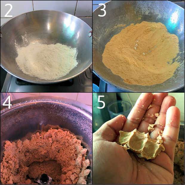- Mezclar la harina de arroz tostado caliente y azúcar y mezcla de maní molido (cuadro 4) durante unos segundos.