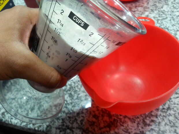 En un recipiente separado, lentamente bate junto el uso de la harina y la sal. Si se mezcla demasiado rápido, irá todo en el aire.