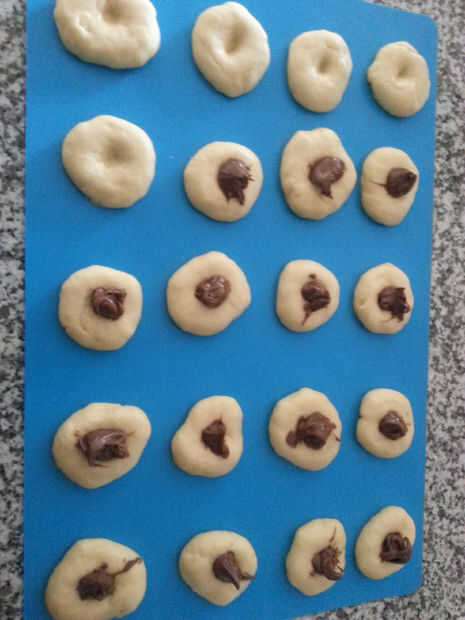 Utilice su palm o cualquier vidrio fondo plano (con spray antiadherente) para aplanar la masa. Con el pulgar, hizo una pequeña sangría en el centro de cada bola y la cuchara en una pequeña porción de Nutella. No hay ninguna cantidad exacta que necesita poner, pero no dude en poner en tanto como crees que serán capaces de rodar para arriba dentro de la masa. Te recomiendo spooning en alrededor de 1 cucharadita por guión.