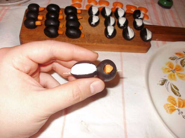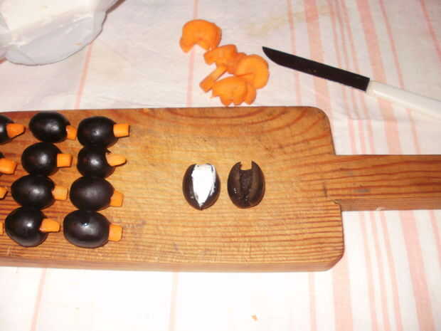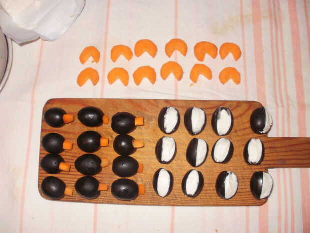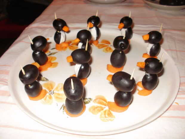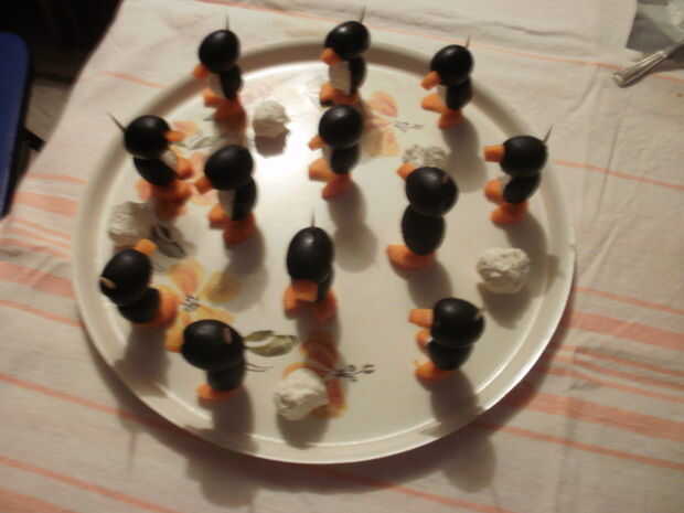 Para el cuerpo de los pingüinos corte un trozo a lo largo de la oliva (1/3) y relleno con queso feta. Después de eso me utiliza un palillo para conectar las tres partes y añade algún efecto de bolas de nieve con bolas de queso pequeño en la bandeja junto a lo pinguinos.
