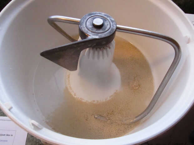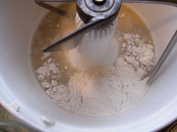En un gran recipiente, preferiblemente una batidora, mezclar levadura y miel {o azúcar, que siempre} en el agua caliente. Deje reposar por un minuto. Echar sal, aceite y la mitad de la harina y mezclar.