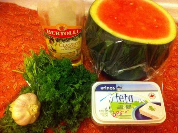 Mordeduras de Snack de sandía con perifollo Pesto y queso Feta. (1 / 5 paso)