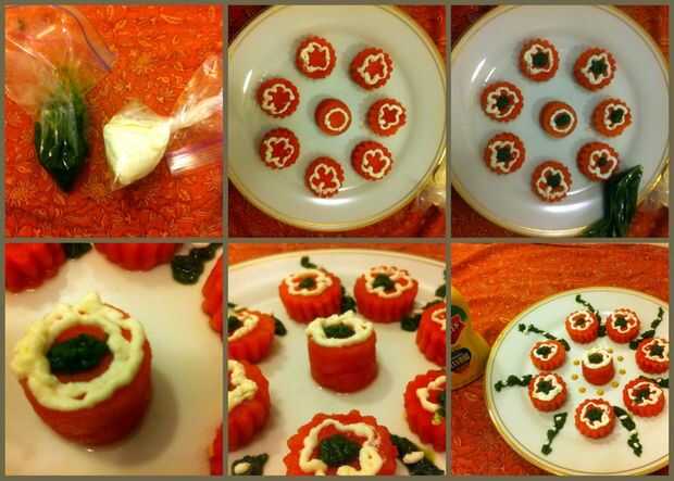 2. Utilizar la Manga pastelera Pesto de perifollo y la tubería la parte interna de las piezas de sandía y también entre las piezas en la placa.