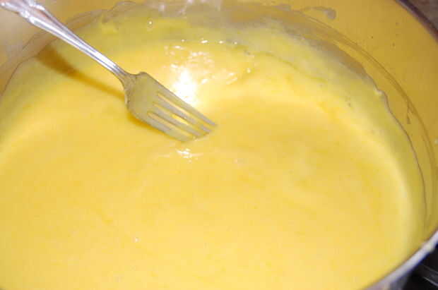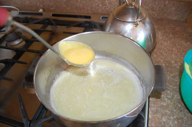 Añadir el zumo de limón y la mantequilla a una sartén. Calor en baja hasta que se derrita la mantequilla. Genio de este limón mantequilla jugo poco a poco en las yemas de algunos en batir y después cambian el proceso y pobres rociar la mezcla de yema de huevo en la sartén y el resto del jugo de limón mientras batir. En cocinar de fuego medio, revolviendo continuamente, hasta que apenas empieza a burbuja y es lo suficientemente gruesa como para cubrir una pieza de platería muy bien. Pobre del limón la cuajada en un recipiente a enfriar.