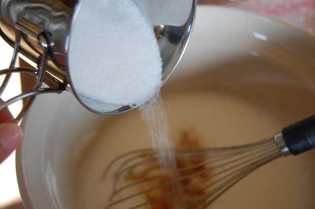 Now onto the egg whites. Añadir el cremor tártaro y el agua y agarrar un bate y empezar a batir juntos. Una vez que esto consigue muy espumoso, añadir la sal y la nuez moscada. A medida que continúe batir lentamente puede empezar a agregar el azúcar, un poco a la vez. En un poco de TI debe tener un grueso mezcla brillante que sostiene tieso picos y usted puede terminar con la vainilla. En la última foto puedes ver cómo espeso el merengue es y cómo los remolinos mantenga sus formas después de dejar de batir.