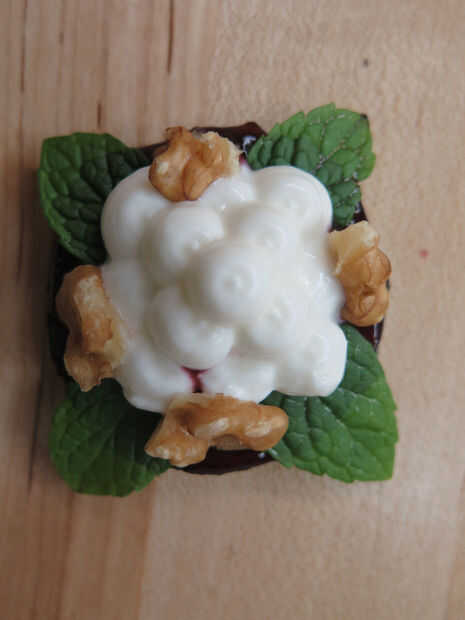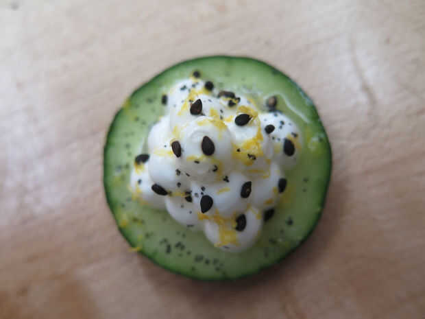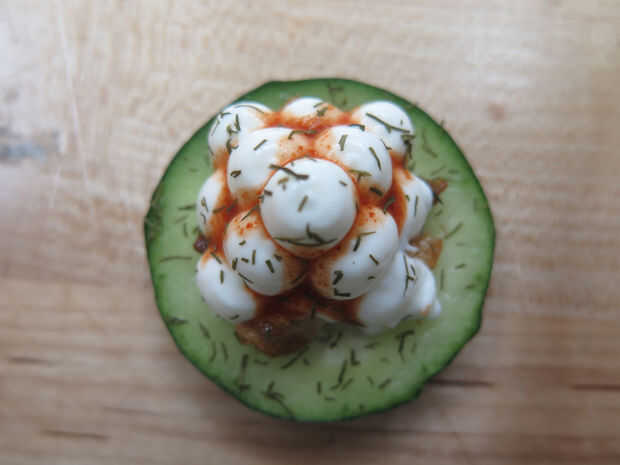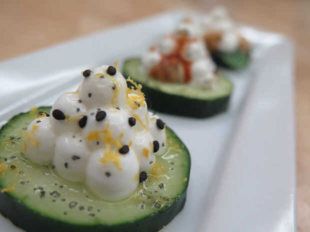 La idea principal detrás de esta receta es utilizar rodajas de pepino como platos comestibles y una porción pequeña de yogur impreso.