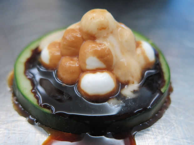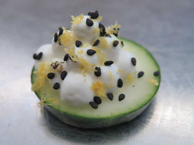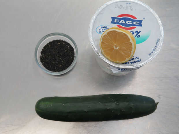 Primera prueba fue semillas y limón ralladura de sésamo negro. Gusto era agradable, equilibrio entre el limón, el yogur y el pepino es muy bueno. Pero después de unas cuantas impresiones, empecé a dudar si el alto contraste entre el yogur y las semillas de sésamo escondía la impresión.