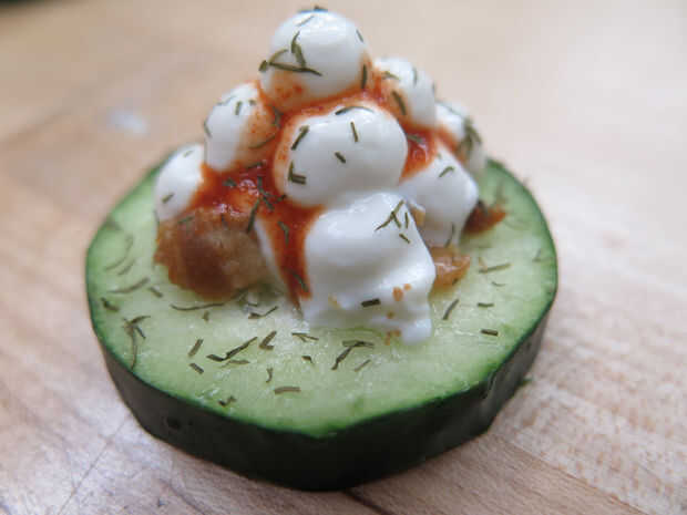Cortar en rodajas el pepino. Coloque unos trocitos de tocino en el centro. Imprimir la pirámide de yogur. Con una pipeta obligó a Tabasco para fluir a lo largo de la pirámide "trincheras". Espolvorear algunos eneldo por encima. HECHO.