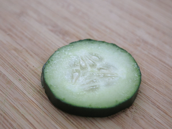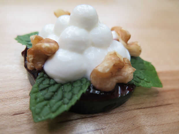 Cortar en rodajas el pepino. Extender una capa de mermelada de Mora en la parte superior. Colocar 4 hojas de menta puntiagudo en la parte superior. La mermelada se actúa como un pegamento que mantiene las hojas en su lugar. Ser creativo! imprimir el yogurt en la parte superior. Coloque algunas nueces alrededor de la pirámide. HECHO.