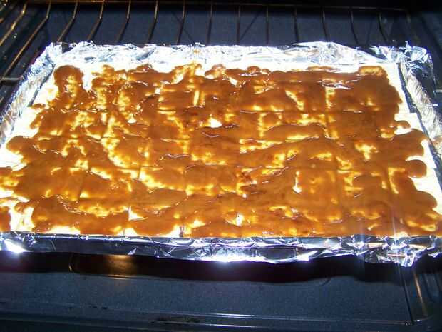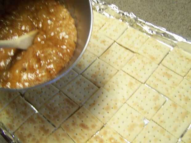 Parar en el paso 5 y vierta el caramelo sobre las galletas, esparciéndolo uniformemente con la cuchara de madera.