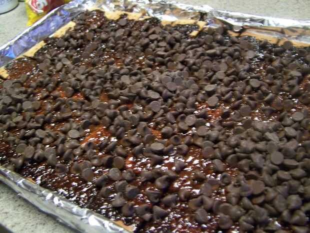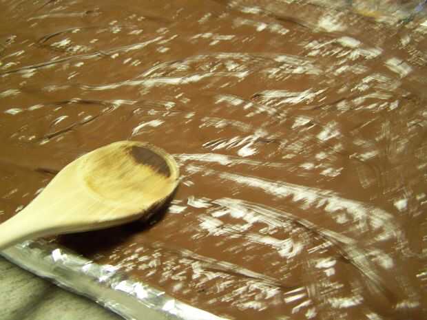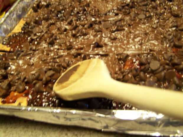 Ahora se diseminan chispas de chocolate sobre la superficie de las galletas y el chocolate uniformemente con una cuchara de madera. Después de eso, cuando el pan esté frío al tacto, poner la bandeja en el congelador durante un par de minutos para que endurezca el chocolate.