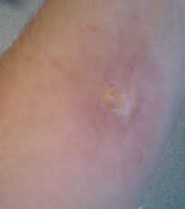 Una vez hayas emparejado el tono de su piel puede comenzar a maquillar a su herida. Utilicé un pincel para aplicar el maquillaje y luego un pincel limpio más grande para mezclar en los bordes. También he añadido algunos púrpura a los alrededores para dar la impresión de trauma. Entonces me puse con algún polvo de fraguado.
