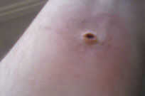 Ahora que la parte exterior de la herida es hora de empezar enrojecimiento al interior de la punción. Para esto utilicé un negro y rojo viene en montones de maquillaje más básicas.
