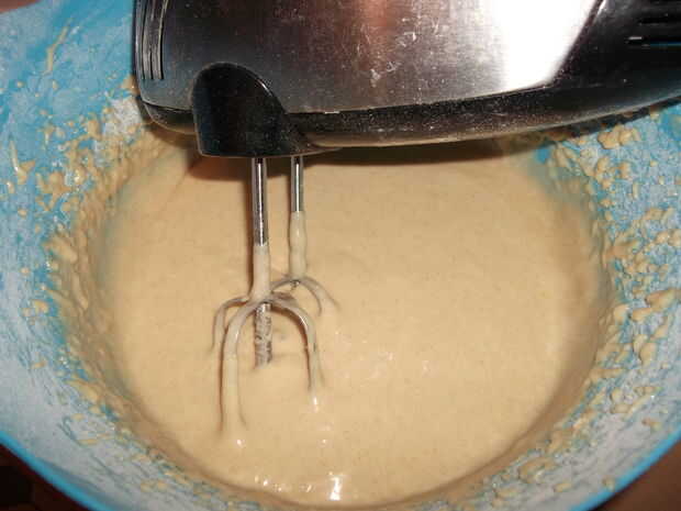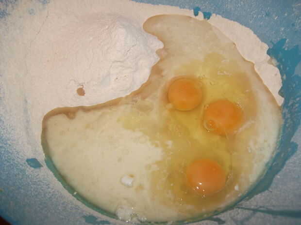 • Cernir harina y polvo de hornear en un tazón. Añadir huevos, leche, aceite, azúcar, esencia de almendra y kirsch (si se usa) ralladura de limón y sal. Batir con un batidor eléctrico para 3-4 minutos.