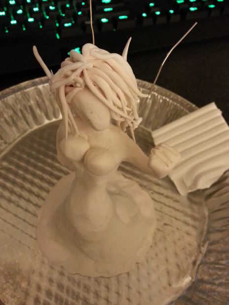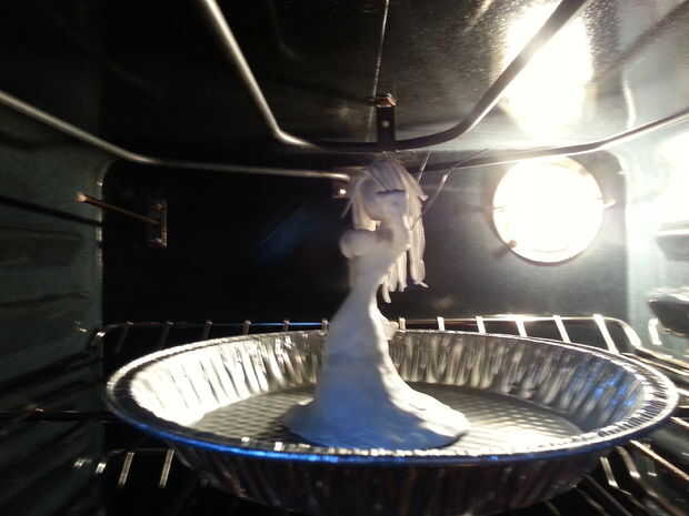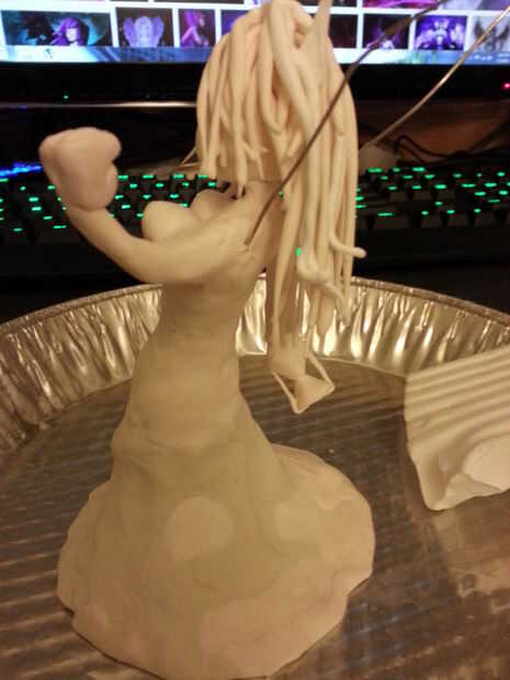 Averiguar cómo desea plantear Morgana. Tenga en cuenta que la estructura debe ser libre o de lo contrario será una) caiga al mismo tiempo de cocción, b) caiga en su vitrina. Escenario (a) es una pesadilla y pasó la primera iteración de este proyecto. El horno se calienta inicialmente la arcilla (Sculpey en este caso) y la arcilla se cuelga y se cae antes de realmente tener una oportunidad para endurecer.