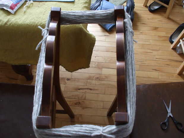 Tomar hilo de una envoltura alrededor de las espaldas de dos sillas. Lazo suelto en 3 lugares para mantener ordenado.