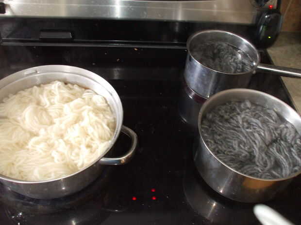 Añadir hilo, asegurándose de que está cubierto por la mezcla, si no añadimos más agua.