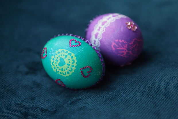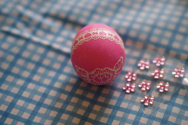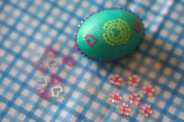 En este punto la corte pegatinas como las plantillas están listas para ser pelado apagado, revelando el color debajo. Añadiendo la joyería del cuerpo palo-añade brillo a tus huevos de Pascua. Personalmente, prefiero las pegatinas hechas de piedras pequeñas que son flexibles.