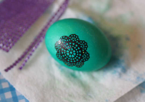 Morir y decorar huevos de Pascua con pegatinas (4 / 5 paso)