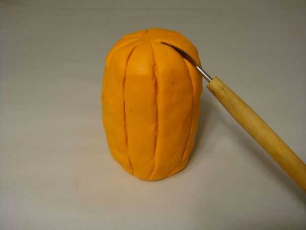 4. usando una herramienta de arcilla, hacer líneas verticales en la calabaza como se muestra.