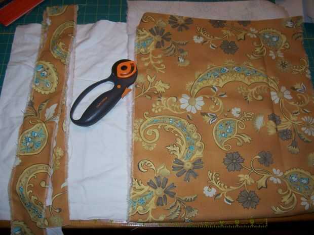 Corte una pieza de tela 14 "x 36" para la bolsa. Cortar dos tiras 2 1/2 "x 33". Cortar dos piezas para bolso forro 14 "x 15 1/2".