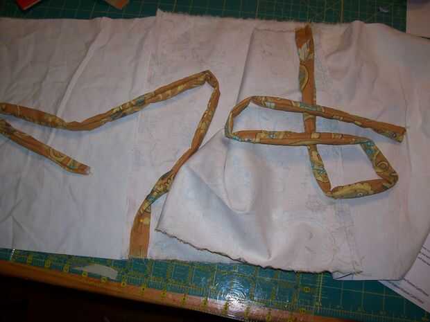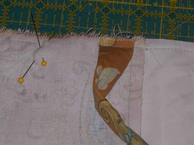 Puntada de borde doblado de la tela exterior, a través de la correa y luego pespuntes y parada. Saltar más de 1,5 pulgadas y comience a coser otra vez a lo largo de la guarnición y la vuelta de esquina. Parar algunas pulgadas en el borde corto de la guarnición (así hay una brecha en la costura en la parte inferior)
