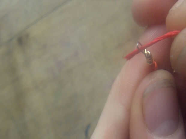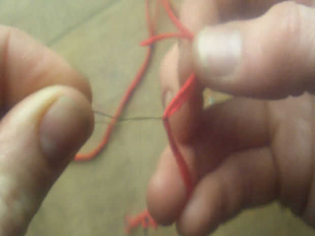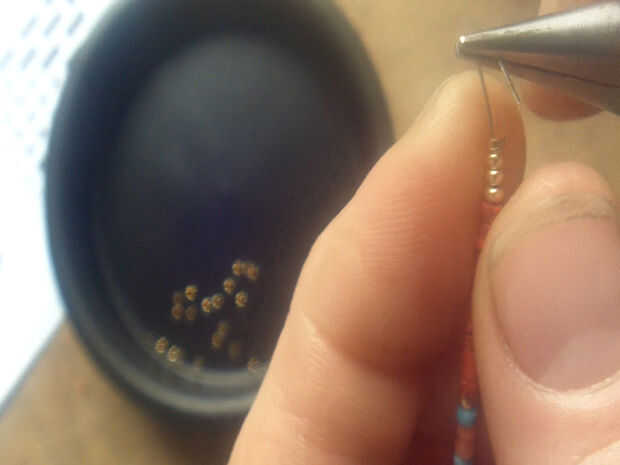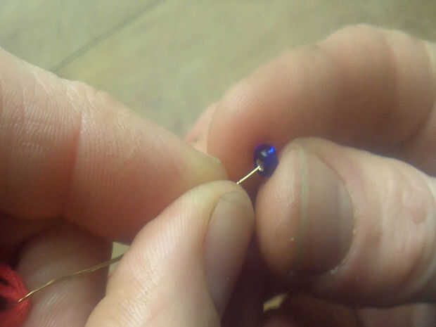 Básicamente añadir otro grano prensado y enrolle el alambre hacia el talón y doble apagado como hecho en el primer paso. Toma unos mechones de seda del bordado y cadena a través de dos lazos en cada extremo. En este punto usted puede tomar su aguja de abalorios o en mi caso, una fina pieza de alambre de metal doblado en dos. Ambos extremos de la seda del bordado en un lado de la pulsera del hilo de rosca y tire por su grano más solicitado.