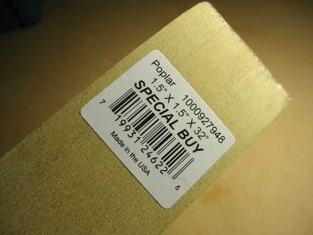 -Madera - he encontrado la madera que estoy trabajando con en home depot. Normalmente tienen estos espacios en blanco de álamo que son 1.5x1.5x30 por algo absurdo como $8,00 pero hace unas semanas tuvieron estos espacios en blanco del 1.5x.1.5x32 "compra especial" para $2,25. Busque la etiqueta, puede ser mezclados.