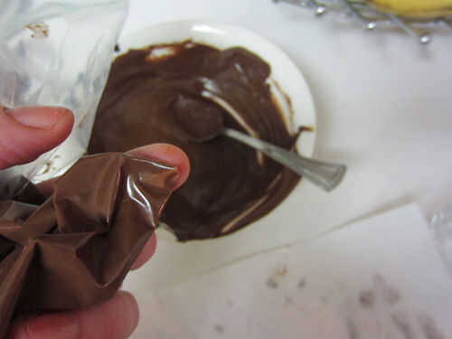 Cuchara el caramelo se funde en una bolsa de plástico y sello. Cortar el un poquito pequeñito de la esquina de la bolsa de plástico.