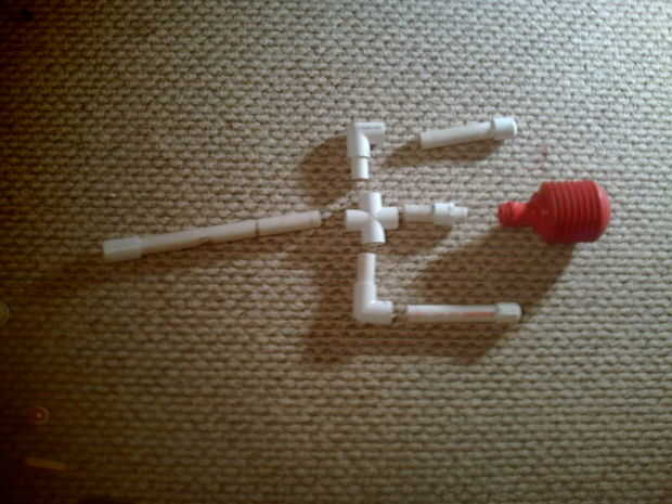 cómo construir un juguete super-soaker-como de PVC.Este mortero de agua está hecha de PVC con una variación en la técnica de "taladro torno" del libro "Cubículo excéntrico." El producto final se lanza sobre un cuarto de galón de agua p