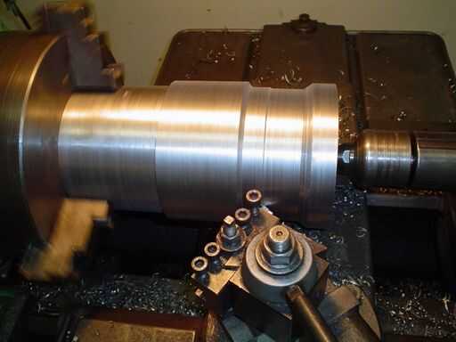 Después de invertir y volver a sujeción del cañón, la mayor parte del perfil exterior fue mecanizado. Entonces final de la recámara del cañón quedó como es ahora.