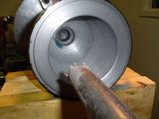 El alesaje fue aumentado entonces usando una barra aburrida. Esto llevó mucho tiempo. Como se puede ver el aburrido bar construí fue de pequeño en comparación con el agujero. No tenía ganas de construir otro. Vista trasera quiero que tenía.