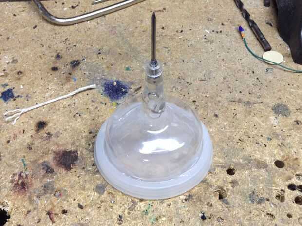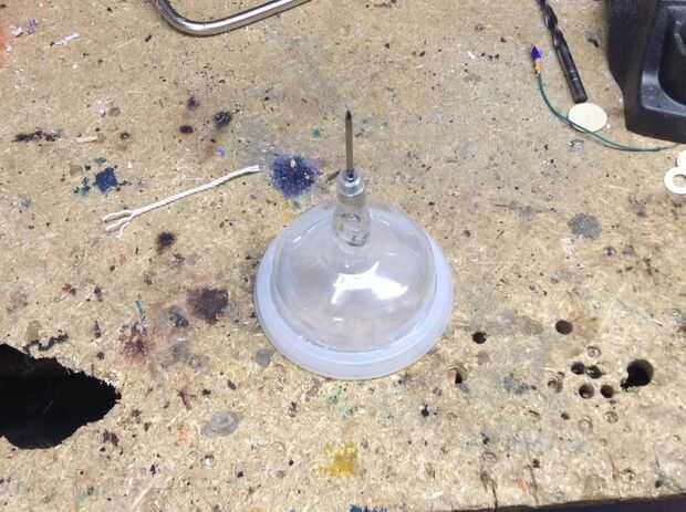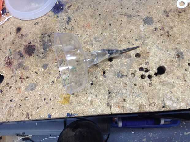 Empezar por taladrar un agujero pequeño en el final de la Copa de martini. Luego inserte un clavo en el extremo y tire la punta por que se pega hacia fuera 2-3 pulgadas. Vierta una cantidad abundante de pegamento caliente en el final y cubrir completamente la uña. Después de que el pegamento se haya secado Haz la tapa circular y pegar el martini vidrio/clavo en ella. Después el vidrio y la tapa se sostienen firmemente por el pegamento, la cinta la cosa entera en el extremo del tubo de PVC.