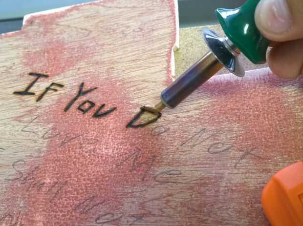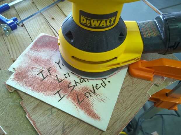 Para obtener los corazones justo, primero hice una plantilla de cartón. de las pude cortar el cereza capas usando la Sierra de mesa y rompecabezas. Luego con una lijadora orbital parcialmente lijar las superficies para revelar más de la red. Después de que fue hecho, quemé una cita en la superficie de la capa. Ahora me no siento ningún poeta, tan sólo fui en línea y encontrar una frase que me gustó de Daniel Beckett. Una vez que todas las letras fueron grabadas en madera, entonces golpeó con la lijadora una vez más antes de pegar en su descanso final coloca en el tablero.