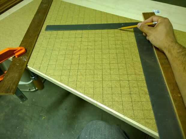 Con las fronteras del mosaico firmemente asegurada use una escuadra de enmarcar para lápiz en una cuadrícula de cuadrados de 1 "x 1" (debe coincidir con la anchura de las tiras de madera, que en este caso 1" de ancho). Ahora busque y los corazones para caber dentro de la cuadrícula de la escala.