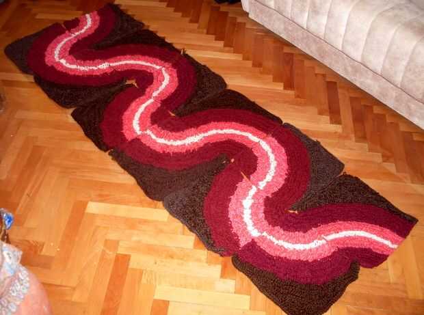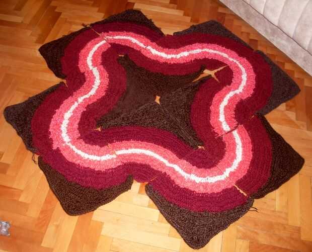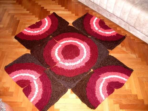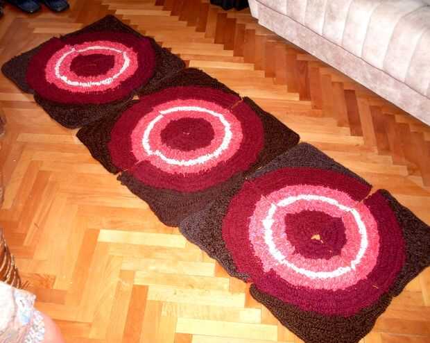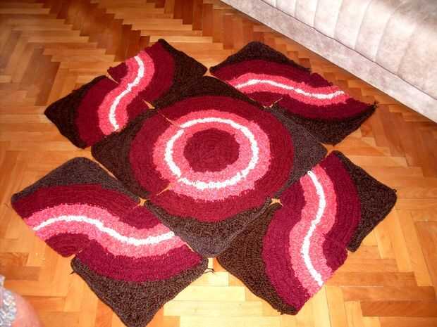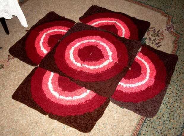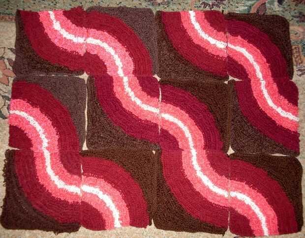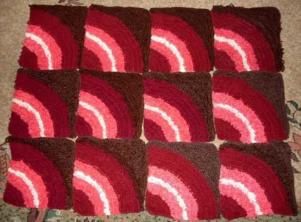 esta alfombra se compone de 12 piezas, todas de la misma forman, tamaño y colores. La técnica es lazo puntadas en punto alto y punto bajo. Los lazos le dan un tacto agradable. Usted puede combinar los cuadrados que quieras, aquí son sólo algunas combinaciones. Principio está en la esquina de rojo oscuro.