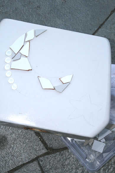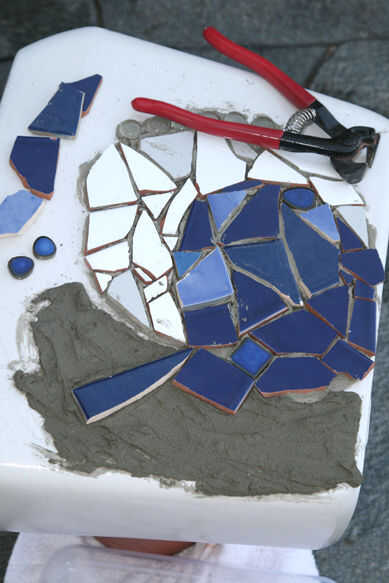 Es importante tomar las secciones a la vez para que el adhesivo no se seque demasiado mucho antes de llegar los azulejos puestos en su lugar. Mis azulejos ya estaban rotos (método 'martillo azulejos envueltos en toalla'), por lo que ahora estaba utilizando principalmente clippers de azulejo para obtener formas más pequeñas. Se adapta a las baldosas piezas no tienen que ser perfecto. De hecho, prefiero que sean un poco wicky wacky - agregando un estilo encantador 'mosaico sucio'. Consejo: Mantenga una bolsa de plástico alrededor de su mezcla de adhesivo de azulejo para evitar que se sequen demasiado rápido. Adhesivo seco también es una razón para baldosas caerse cuando un proyecto está terminado - y Créanme - cuando inviertes tiempo en mosaicos no desea que esto suceda!