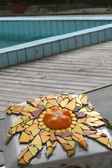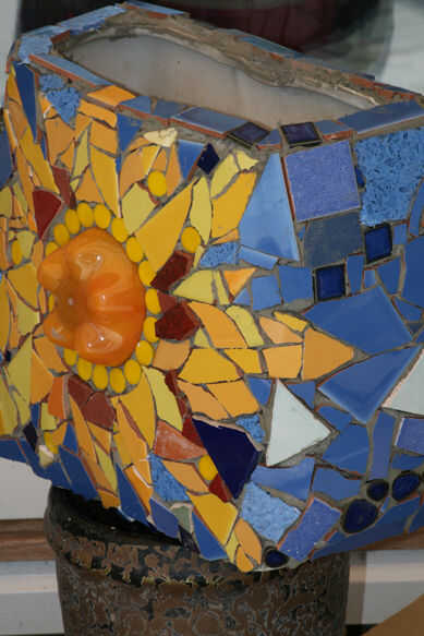 Aquí está su proyecto como se verá cuando usted consigue todas las fichas en su lugar. ¿Si no está acostumbrado a trabajar con mosaicos, este es el punto donde paso atrás y decir... "me pasé todo ese tiempo trabajando en este monstruo? ¿Qué estaba pensando?" Sea paciente! La verdadera belleza de los mosaicos no se revela hasta que haya terminado el último paso! Deje la pieza al menos 24 horas para que el adhesivo se seque correctamente.